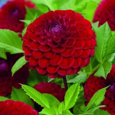 Ball Dahlia 'Cornel' is a classic beauty with impeccable form, producing perfectly rounded ball-shaped blooms in a rich, velvety shade of deep red. Each petal is tightly cupped and arranged in spiraling layers, giving the flower its signature plush, symmetrical silhouette.