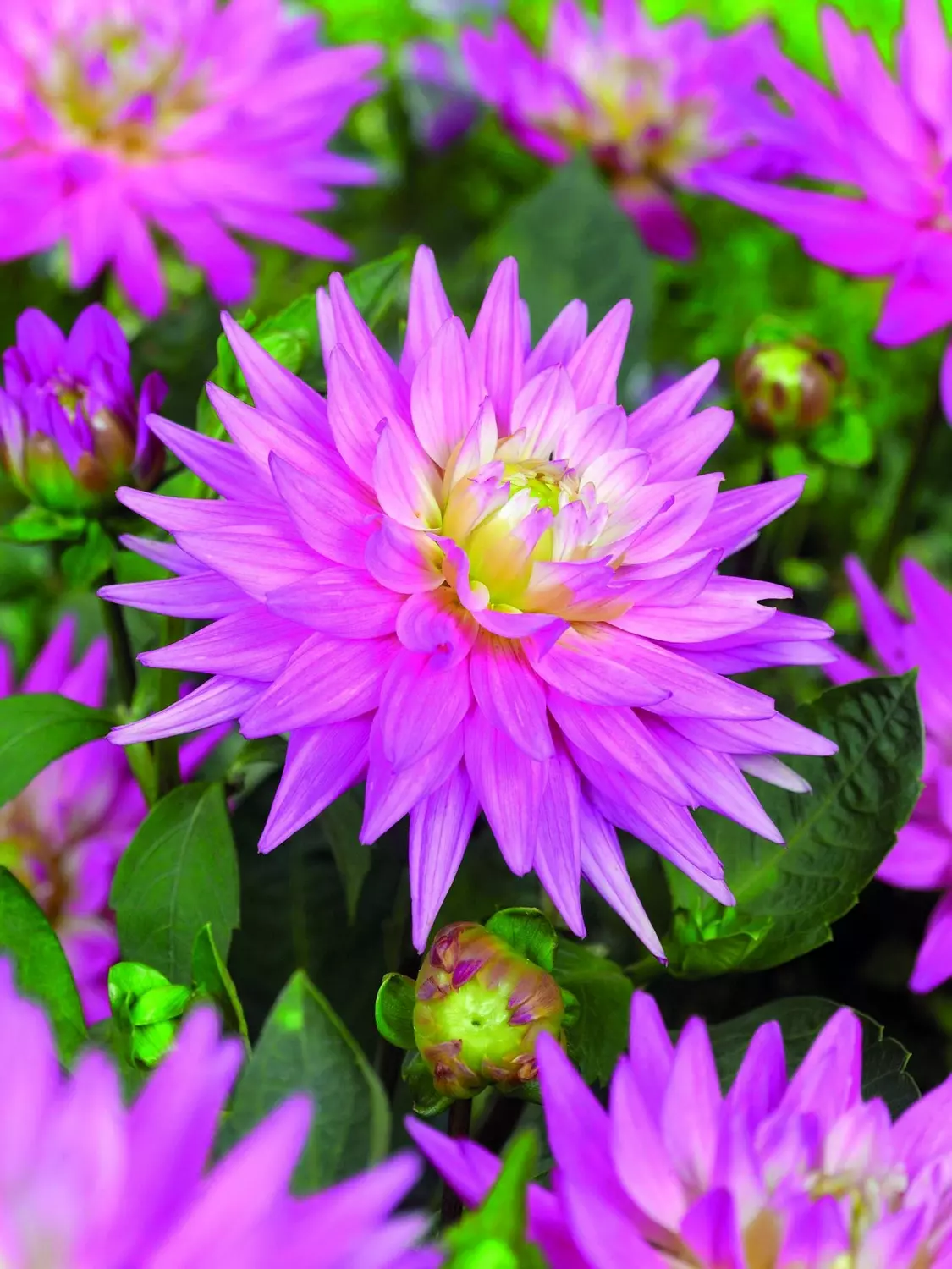Fuchsia-pink blooms of Karma Dahlia Pink Corona bring vibrant energy to any garden. Each flower unfolds with layered, vivid petals, creating an eye-catching display which complements borders and containers.