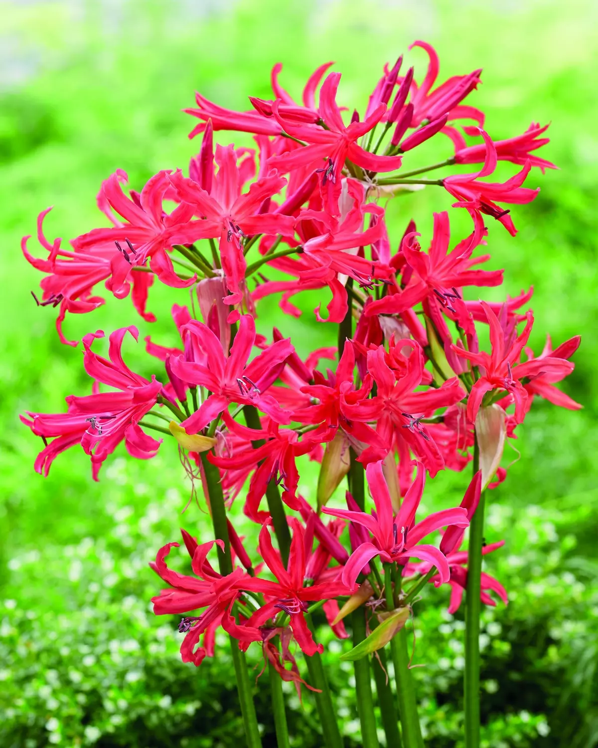 Nerine bowdenii ‘Pearls of Cherry’ brings a lively splash of cherry rose-pink to the autumn garden, unfurling elegant clusters of slender, curling petals that glow with warmth as the season cools.