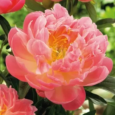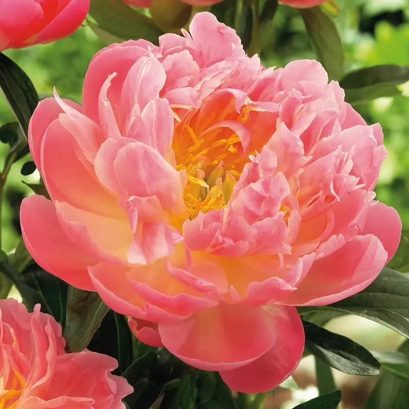 Coral-pink petals fading to apricot hues form the radiant double blooms of Paeonies 'Hawaiian Coral'. Held on strong stems, these peony flowers brighten borders with warmth and vitality.