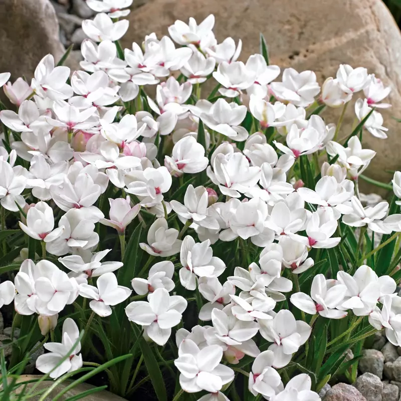 Ideal for intimate garden designs, the delicate tones of Rhodohypoxis 'Baurii The Bride blend effortlessly with vibrant companions, offering a polished, harmonious look.