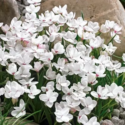 Soft white-pink blooms radiate gentle elegance in Rhodohypoxis 'Baurii The Bride'. Compact and luminous, this plant thrives in rockeries or containers, bringing freshness to any outdoor area.